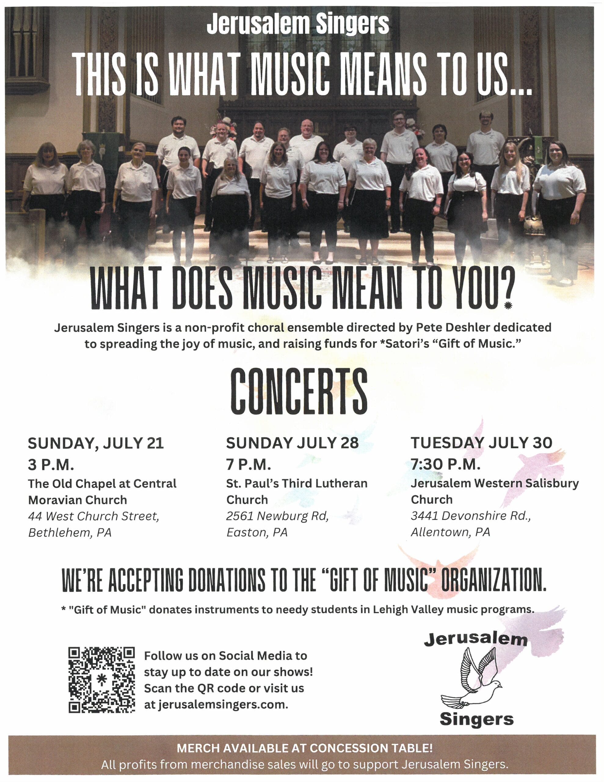 Jerusalem Singers is a non-profit choral ensemble directed by Pete Deshler dedicated to spreading the joy of music and raising...
