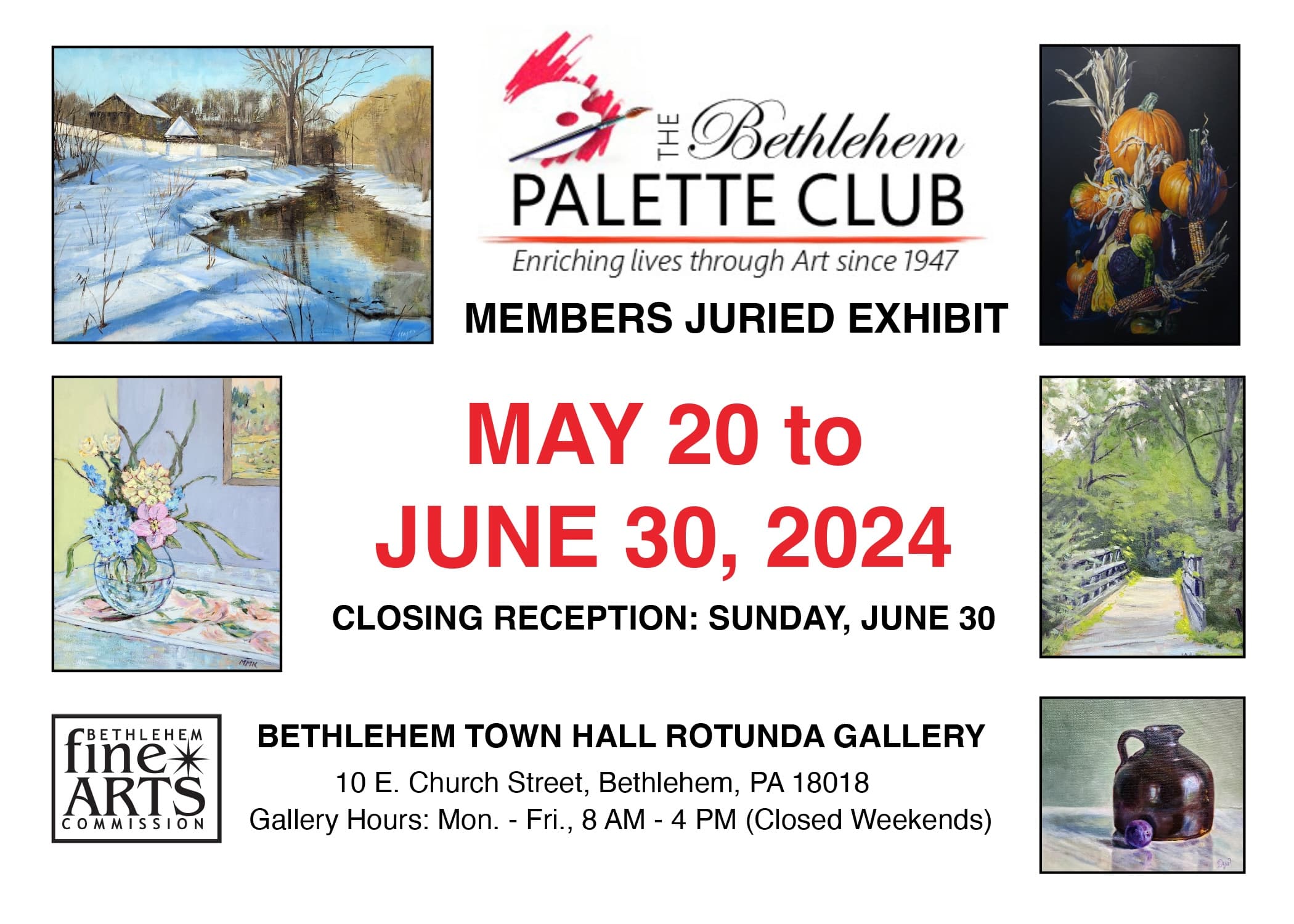 The Bethlehem Palette Club will be exhibiting a Members Juried Exhibition at the Bethlehem Town Hall Rotunda Gallery from May...
