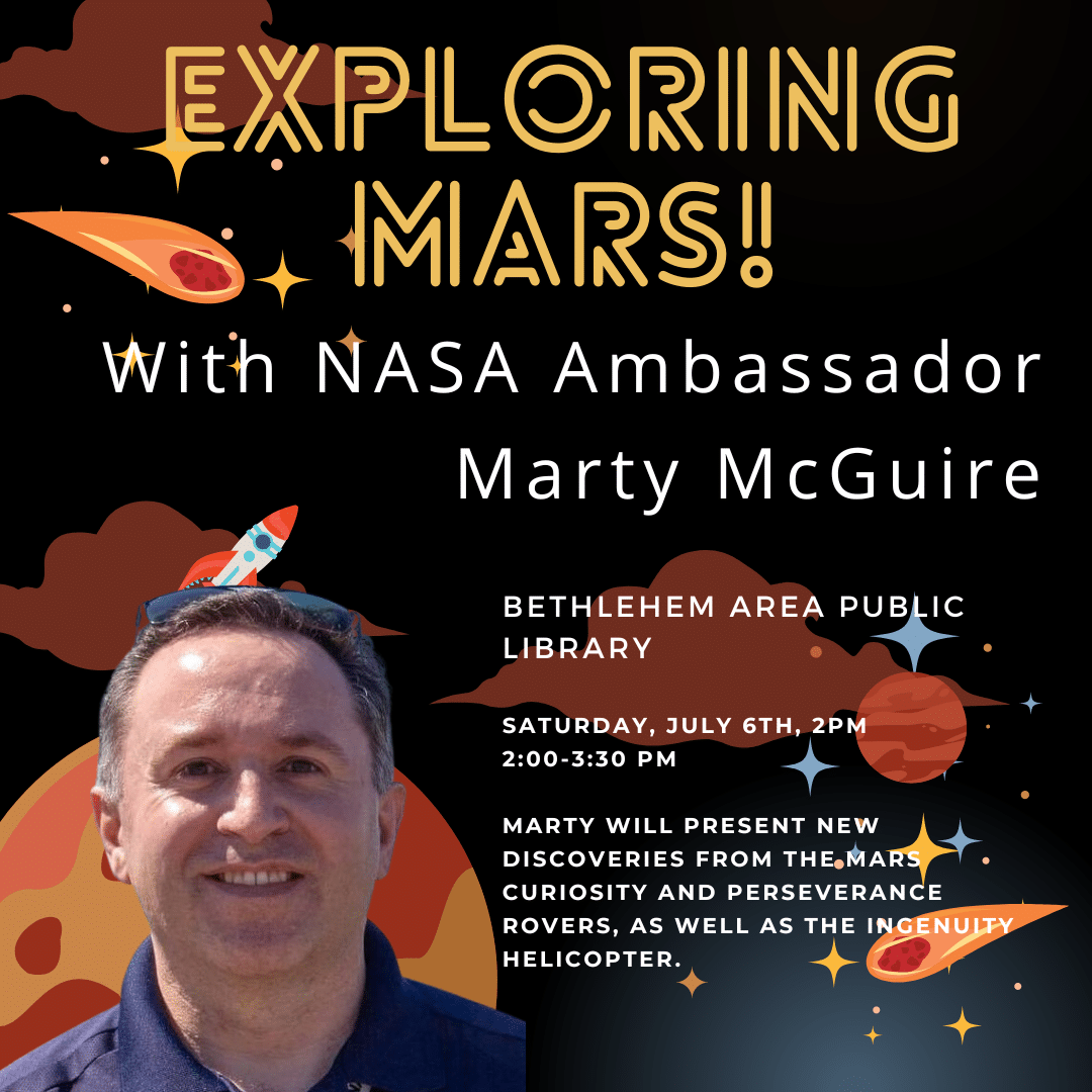 🚀✨ Exploring Mars ✨🚀 🌟 Marty McGuire, NASA Ambassador, presents "Exploring Mars"! 🌟 📅 Date: Saturday, July 6, 2024 🕑...