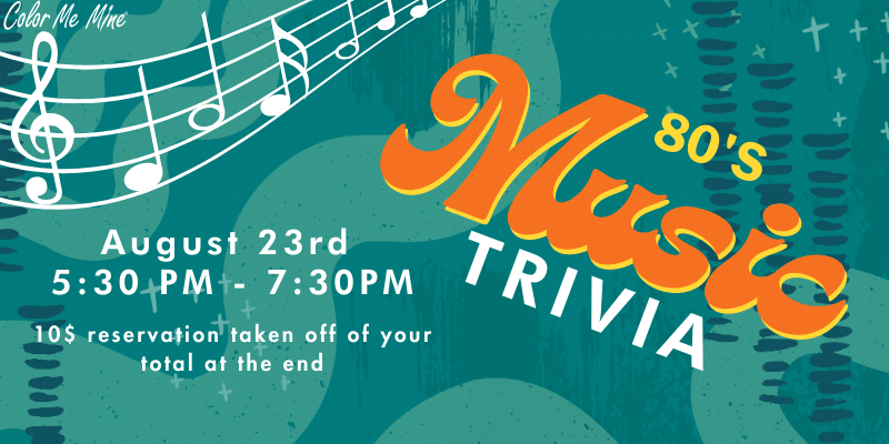Enjoy a night out with your friends painting pottery and answering 80s Music themed Trivia! Trivia winners gets a prize!...