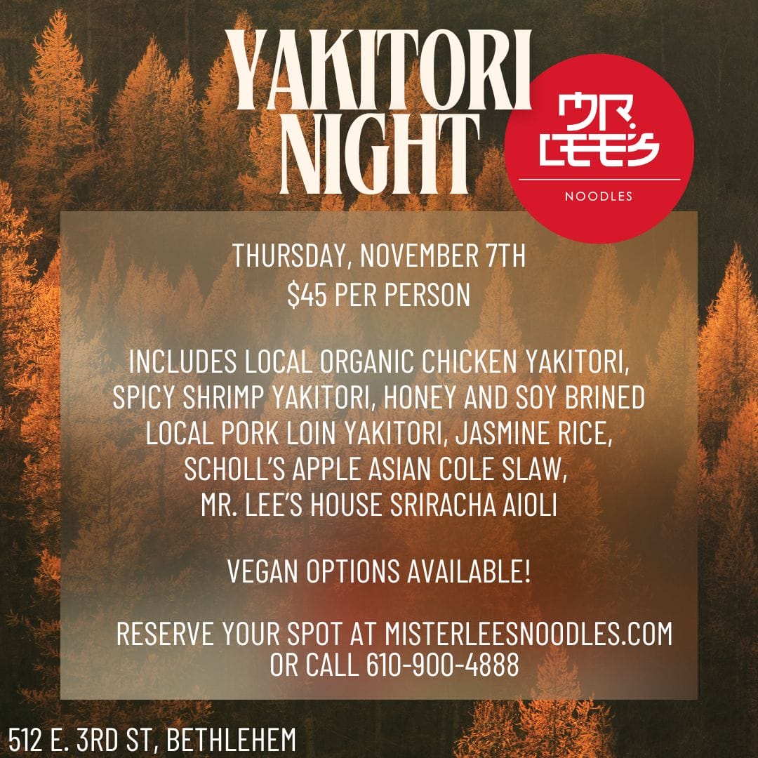 Enjoy a special pre-fixe menu of curated selections for Yakitori Night at Mister Lee’s Noodles in Bethlehem. Yakitori is a...