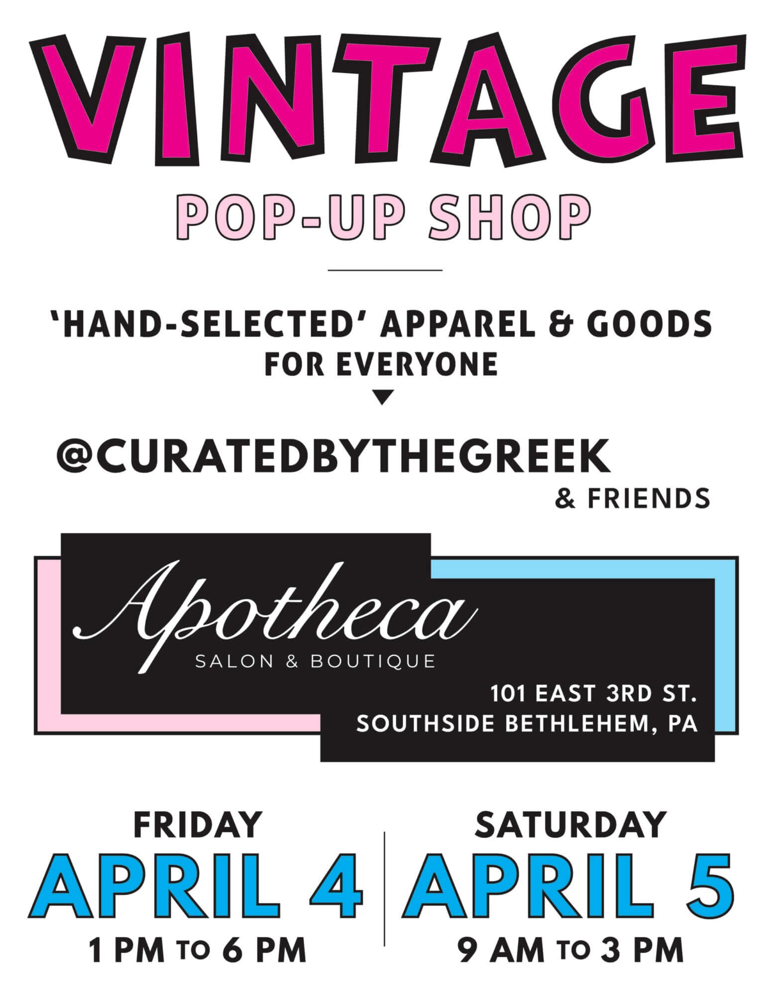 Don’t miss this two-day Vintage Clothing Pop-Up Shop at Apotheca Salon & Boutique on Friday, April 4th and Saturday, April...