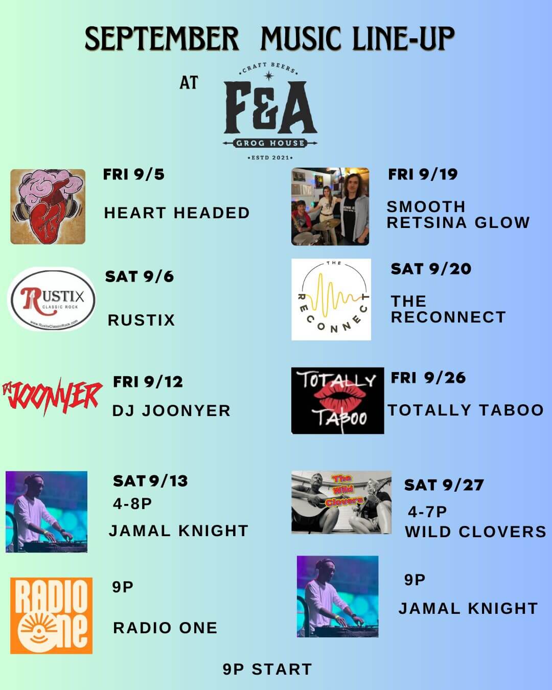 September Music Line-Up at F&A Grog House Friday, September 5 – 9:00 PM🎶 Heart Headed Saturday, September 6 – 9:00...