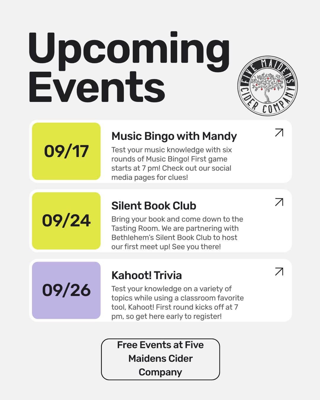 Music Bingo, Trivia, and Silent Book Club dates for September at Five Maidens Cider Company