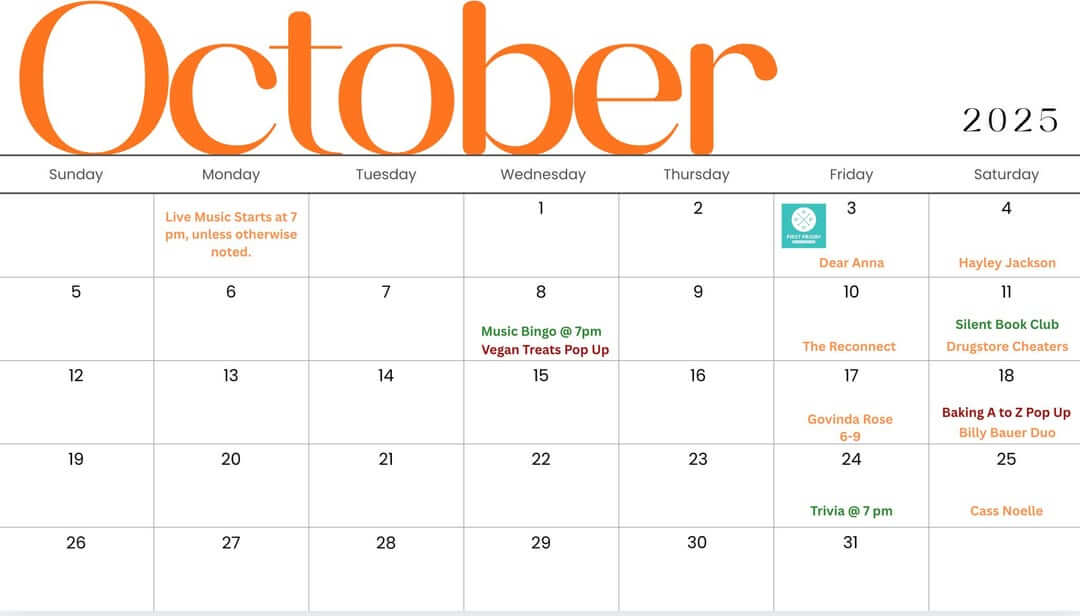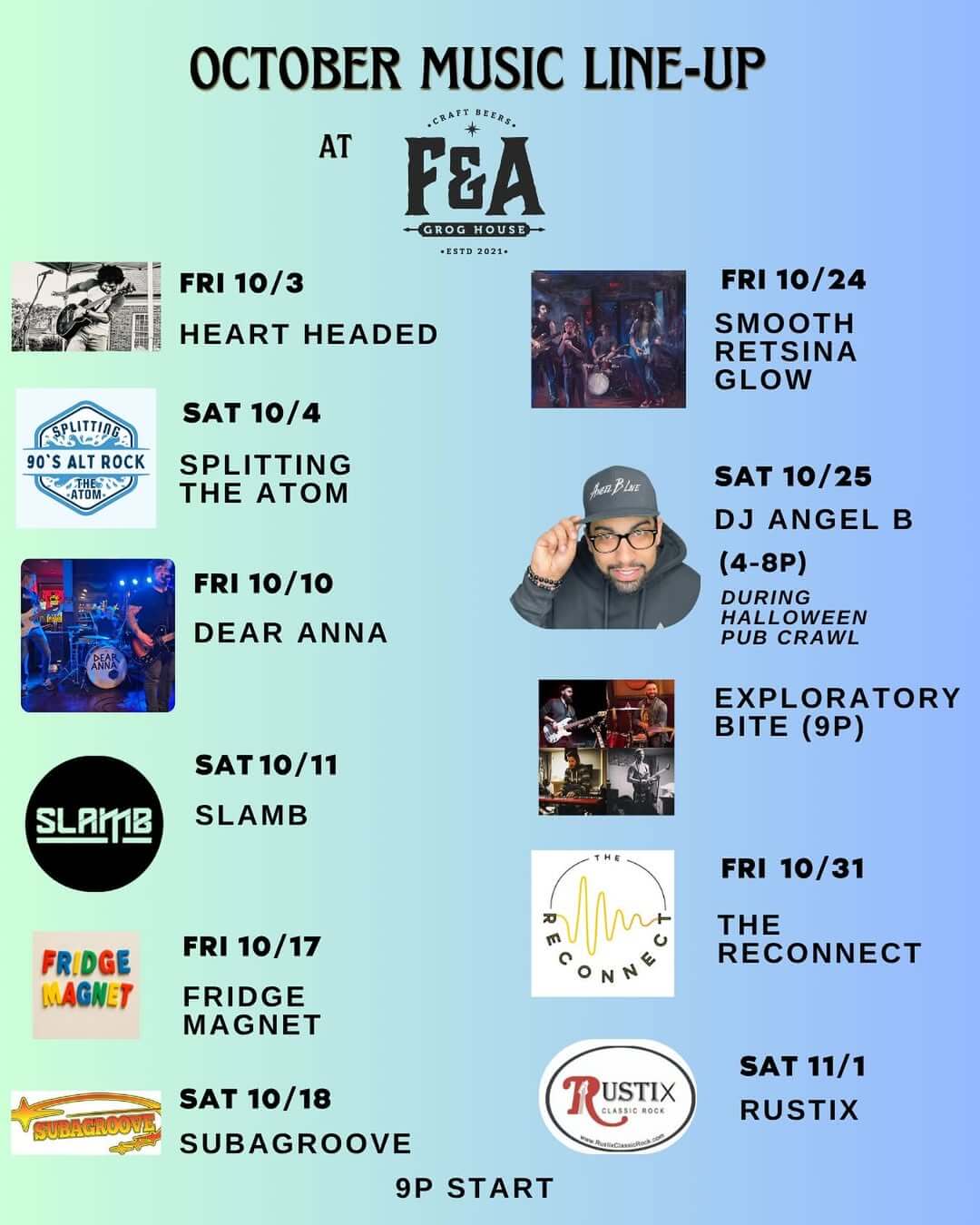October Music & Events Line-Up at F&A Grog House Friday- 10/3 First Friday-Southside Arts District Daily Drink Special: $5 well drinks...
