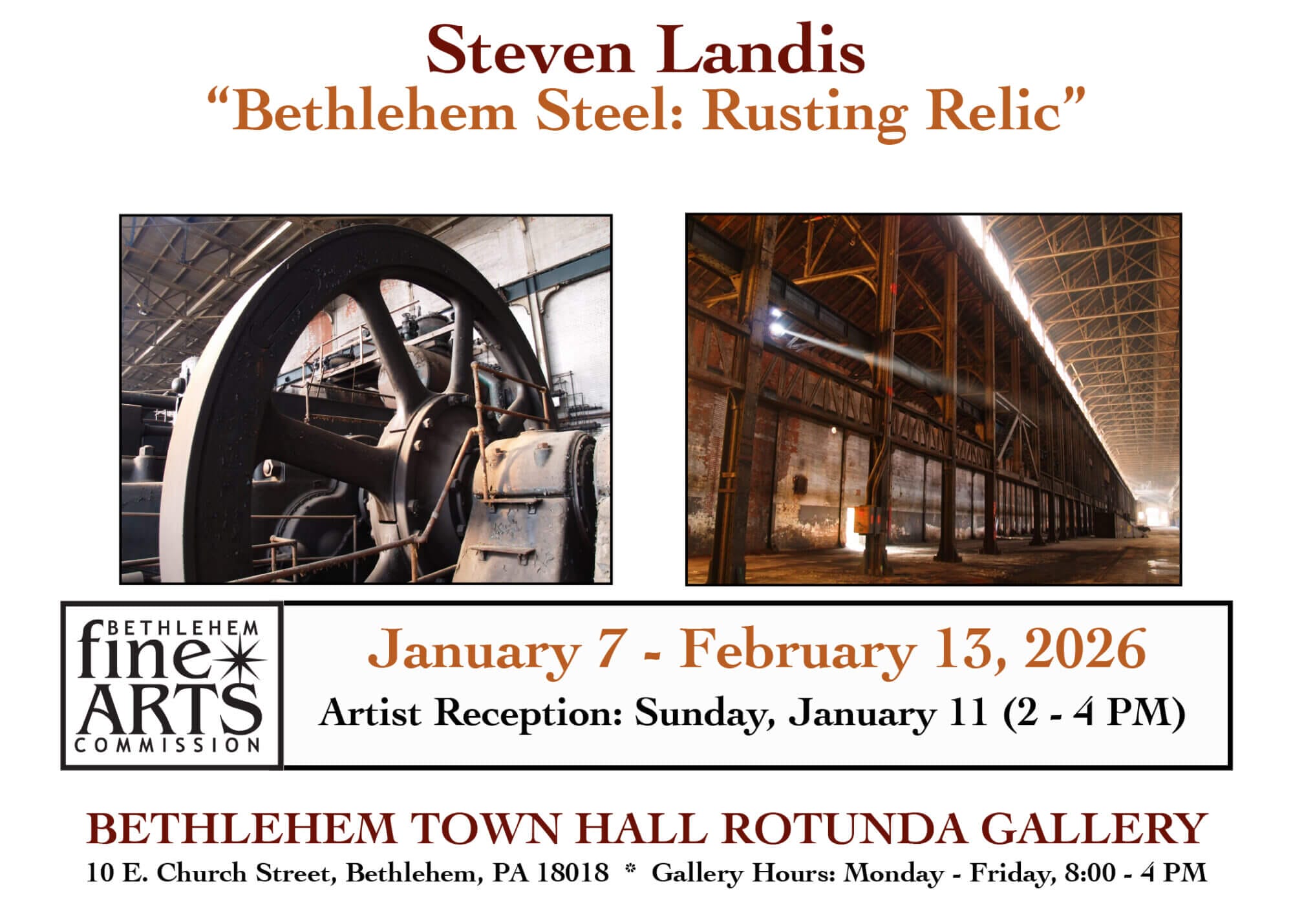 Lehigh Valley photographer, Steven Landis, will be exhibiting his photographs “Bethlehem Steel: Rusting Relic” at the Bethlehem Town Hall Rotunda...