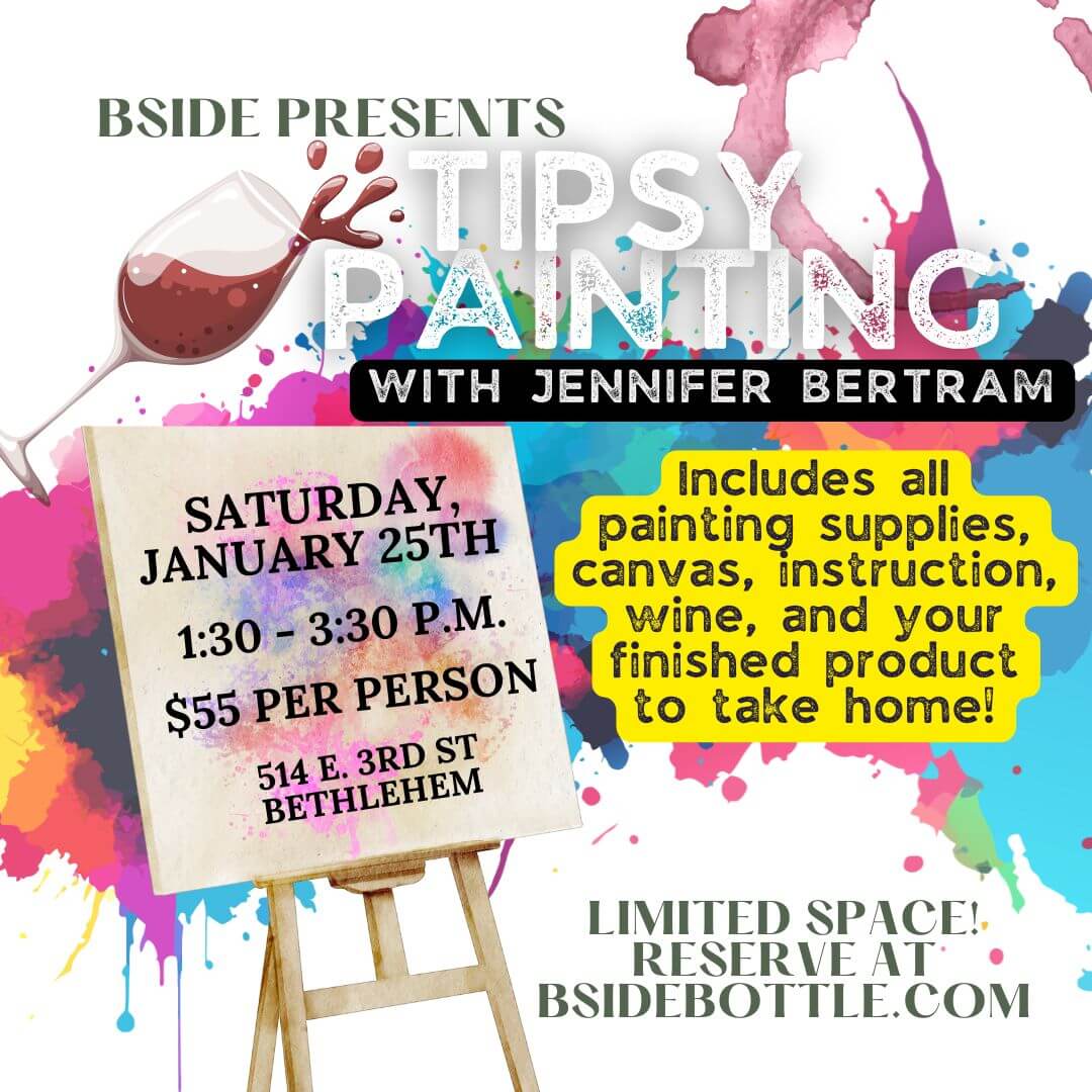 Join B-Side Bethlehem and Jennifer Bertram as we present our first Tipsy Painting event for 2025! Jennifer will provide all...