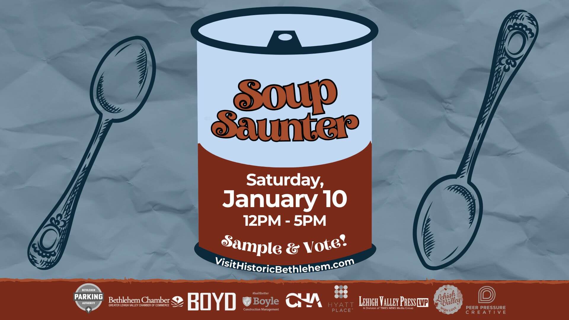 Join us for the Historic District’s Soup Saunter on January 10, 2026. Stroll down the streets of Historic Downtown Bethlehem, and enjoy tasty soup samples from some of your favorite restaurants.