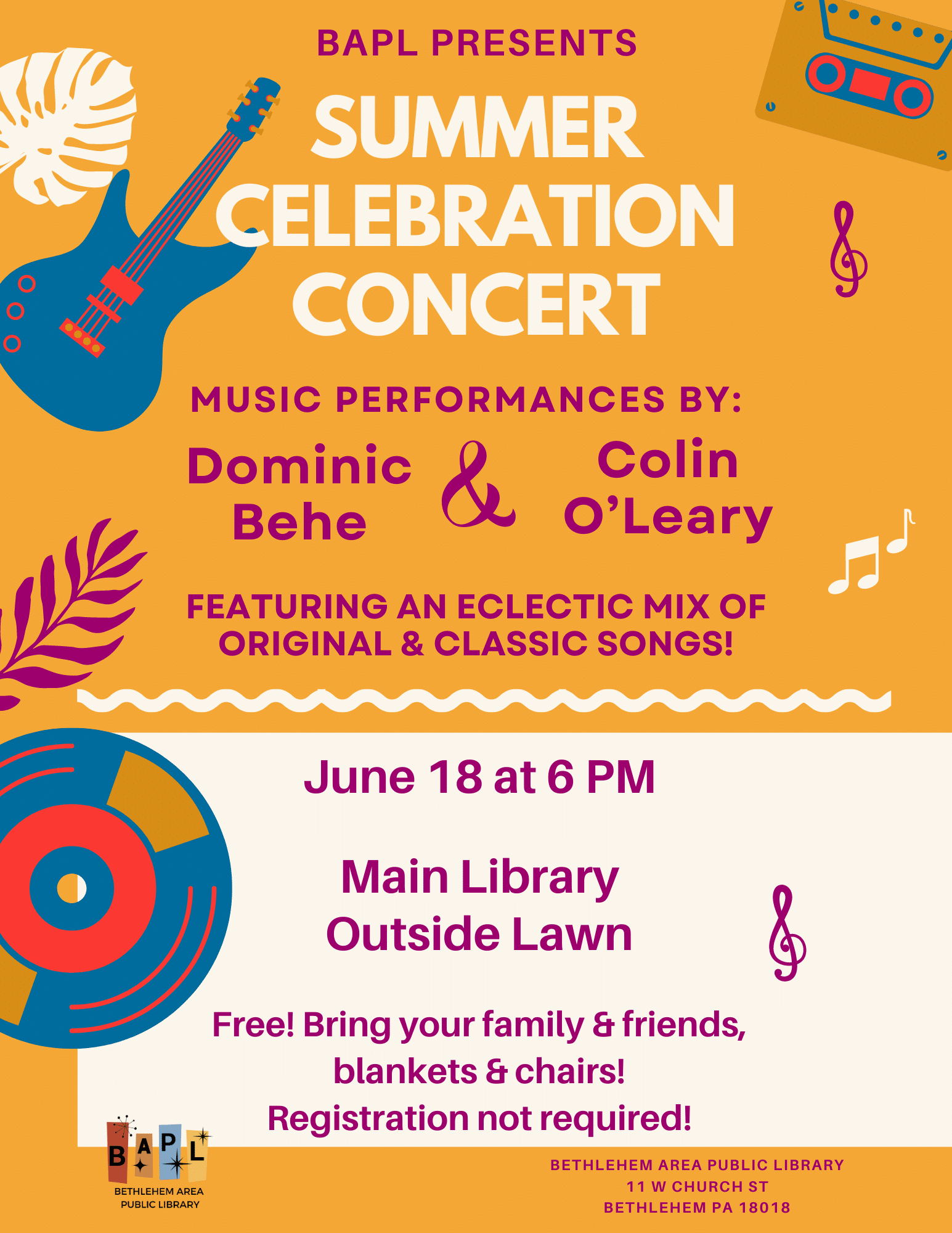 Bethlehem Area Public Library - Main Library - 11 W Church Street, Bethlehem PA 18018 11 W Church Street, bethlehem, PA, United StatesBAPL Presents a Summer Celebration Concert with musical performances by Colin O'Leary and Dominic Behe featuring an eclectic mix of...
