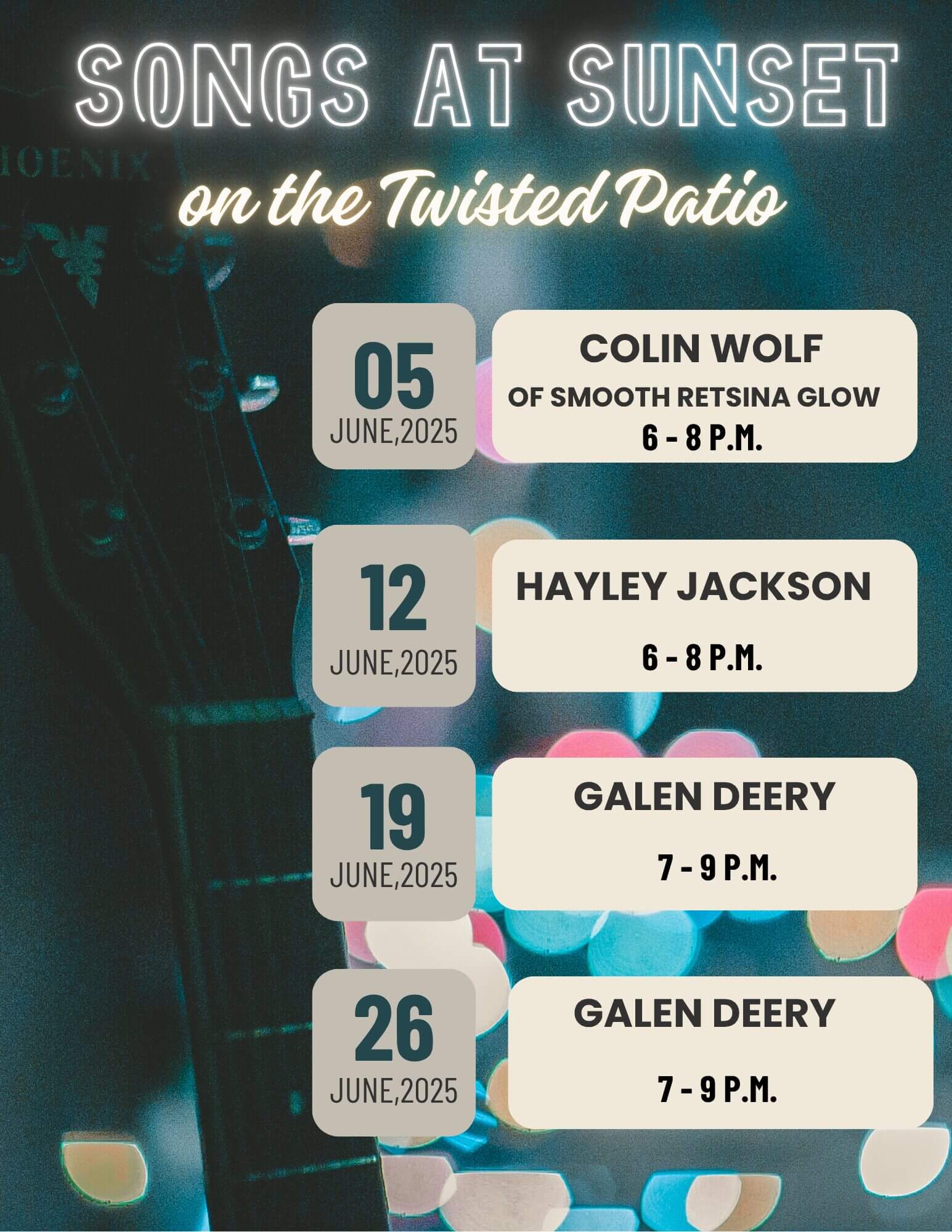 at Join us every Thursday in June from 6-8 P.M. for “Songs at Sunset” on the Twisted Olive patio. Enjoy... |