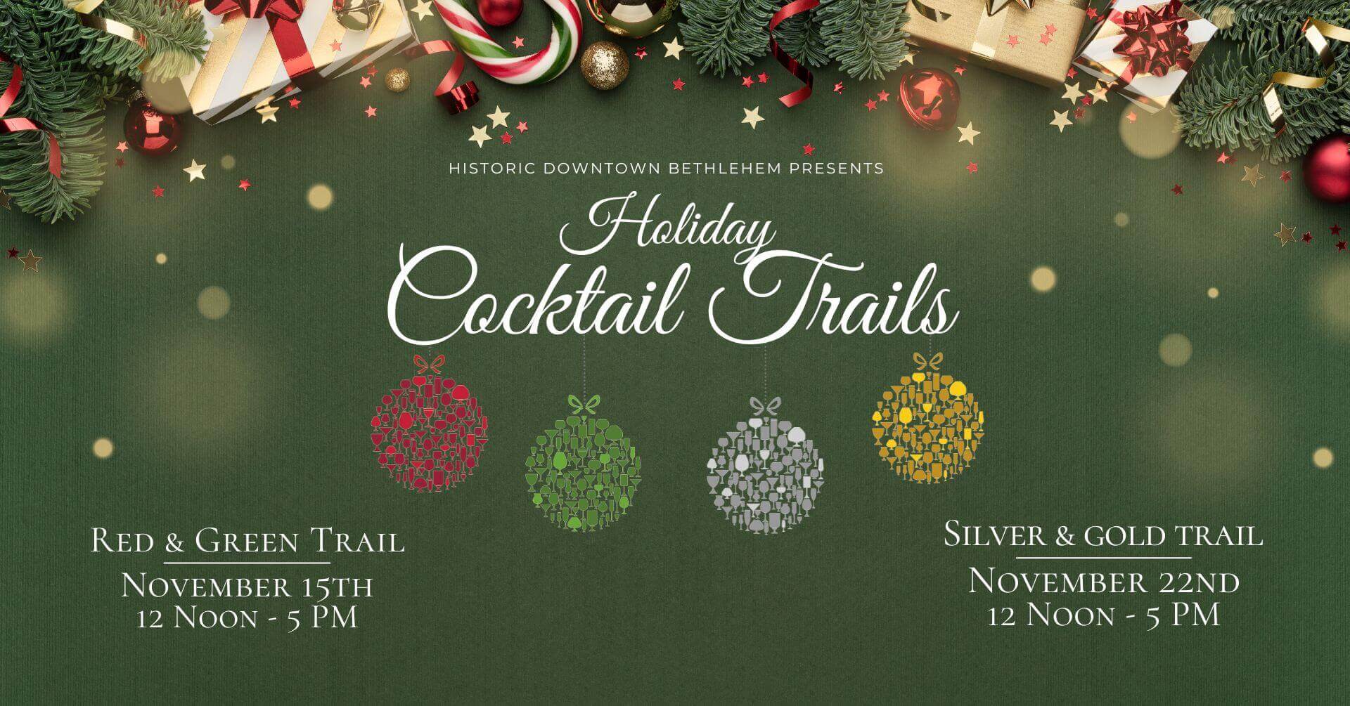 Join us for our Annual Historic Bethlehem Holiday Cocktail Trail on November 15th, from 12:00pm to 5:00pm with the Red & Green Trails.
