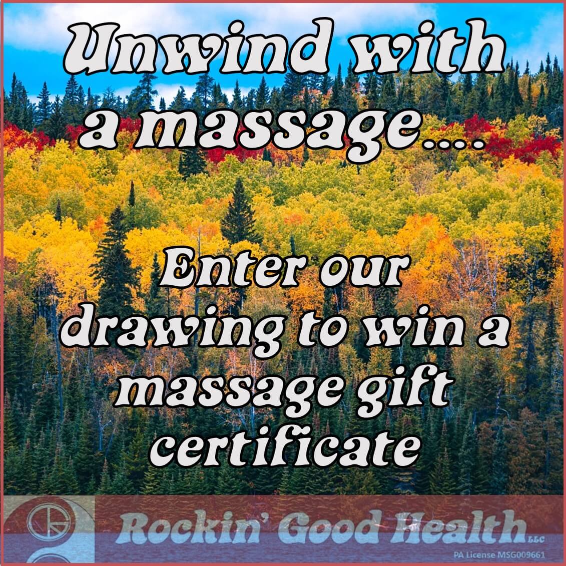 Treat Yourself This October! Enter Rockin’ Good Health’s monthly drawing for a chance to win a free 60-minute massage....