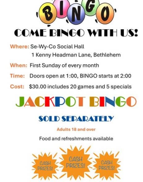 Join us for bingo 1st Sunday Monthly at Se-Wy-Co Social Hall for the monthly fundraising event to benefit The Society...