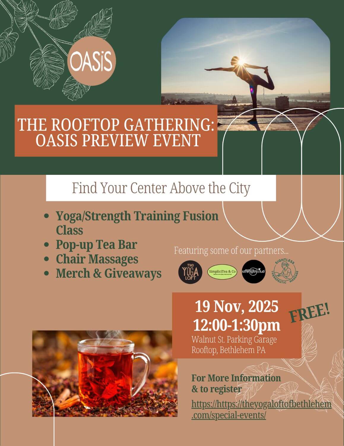 Join us atop the Walnut Street Garage in Bethlehem for The Rooftop Gathering: Oasis Preview Event — a free community wellness experience hosted by local partners including The Yoga Loft, BoomFit Strength Club, SimpliciTea & Co., and Sightless Therapeutic Massage.